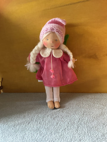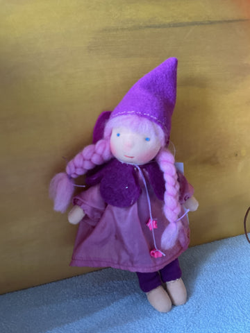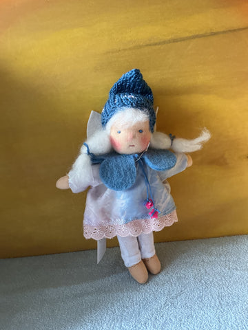 Sweet fairy dolls with hand dyed silk dresses that float in the breeze and a delight to hold in your hands.  With stitched on cotton leggings and felt shiny wings these will be treasured by your child and storytellers alike……