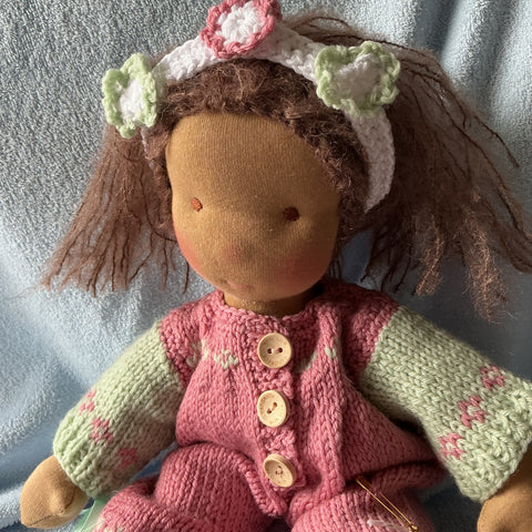 Gentle little Rosebud.... One just cant help smiling when you see her in her hand knitted merino jumpsuit! Rosebud measures 35cm tall and is fully formed with a bellybutton and a bottom. her mohair hair is in a shorter cut but can still be styled differently. Under the jumpsuit she wears cotton knit undies and her crocheted cotton shoes and hair band makes her outfit complete. She dearly needs a kind and caring dolly mama and hopes to be adopted soon.